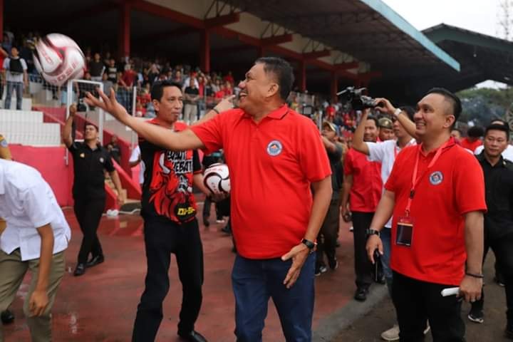Gubernur Sulut, Olly Dondokambey ketika hadir di Stadion Klabat sekaligus membagikan bola