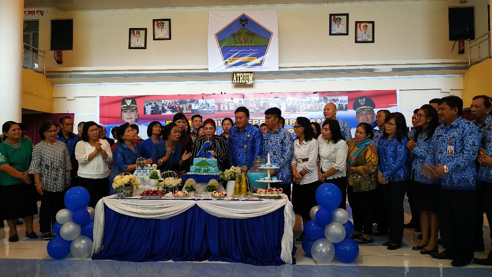 Pada momen itu Bupati didampingi Sekda Ir Jemmy H Kuhu dan para kepala SKPD meniup lilin perayaan empat tahun kepemimpinan. Bupati juga membagikan kue kepada para pejabat dan para hamba Tuhan yang hadir. Serta menyerahkan buku profil empat tahun kepemimpinan kepada kepala SKPD.
