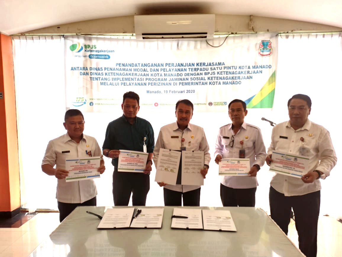 METRO, Manado- BPJS Ketenagakerjaan, Dinas Penanaman Modal dan Pelayanan Terpadu Satu Pintu (DPMPTSP) Kota Manado dan Dinas Ketenagakerjaan Kota Manado melakukan penandatanganan MoU terkait implementasi program jaminan sosial ketenagakerjaan (jamsosnaker) melalui pelayanan perijinan di Pemerintah Kota Manado, pada Rabu (19/2) kemarin.