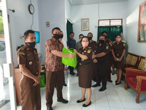 Kajari Sitaro Fien Ering SH MH membagikan bantuan kepada stafnya.