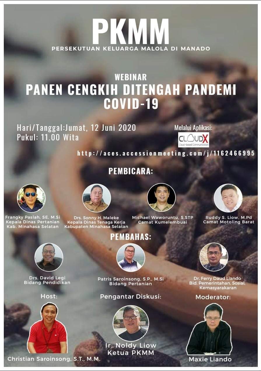 METRO, Manado– Potensi hasil pertanian dan ancaman wabah virus corona (Covid-19) khususnya cengkih bakal menjadi topik yang akan dikupas dalam webinar atau seminar dalam website secara virtual yang digelar Persekutuan Keluarga Malola di Manado (PKMM), Jumat (12/6/2020) pukul 11.00 Wita.
