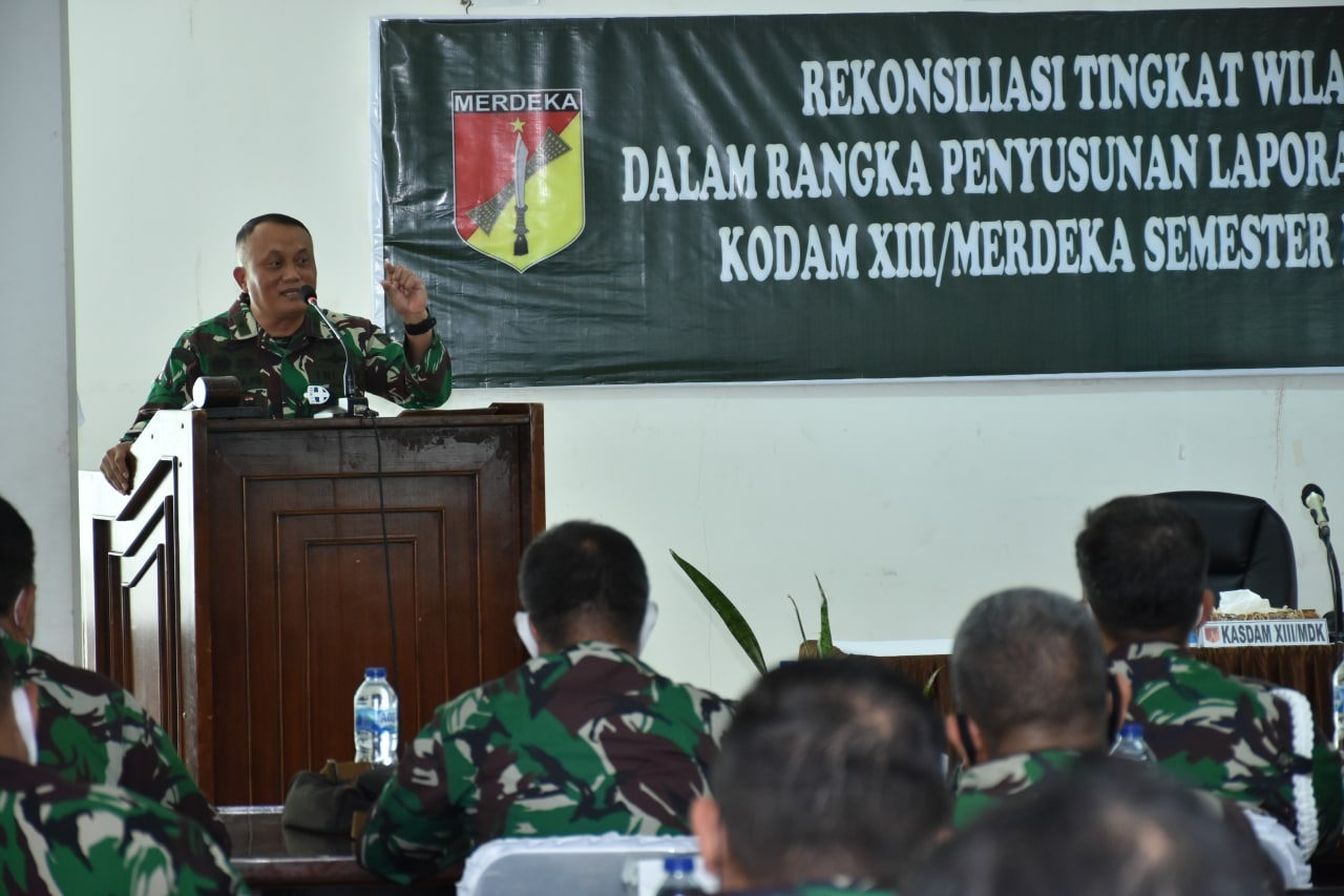 METRO, Manado- Kasdam XIII/Merdeka Brigjen TNI Wirana Prasetya Budi SE memimpin kegiatan rekonsiliasi tingkat wilayah dalam rangka penyusunan laporan keuangan Kodam XIII/Merdeka Semester II Tahun 2020. Kegiatan digelar di Gedung C Ex Pomdam XIII/Merdeka, Selasa (12/01).