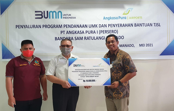 METRO, Manado- Menyambut Hari Raya Idul Fitri 1442 H, PT Angkasa Pura I (Persero) Bandara Udara Sam Ratulangi Manado menyerahkan bantuan melalui Program Tanggung Jawab Sosial dan Lingkungan (TJSL) pada Jumat (7/5/2021) pagi.