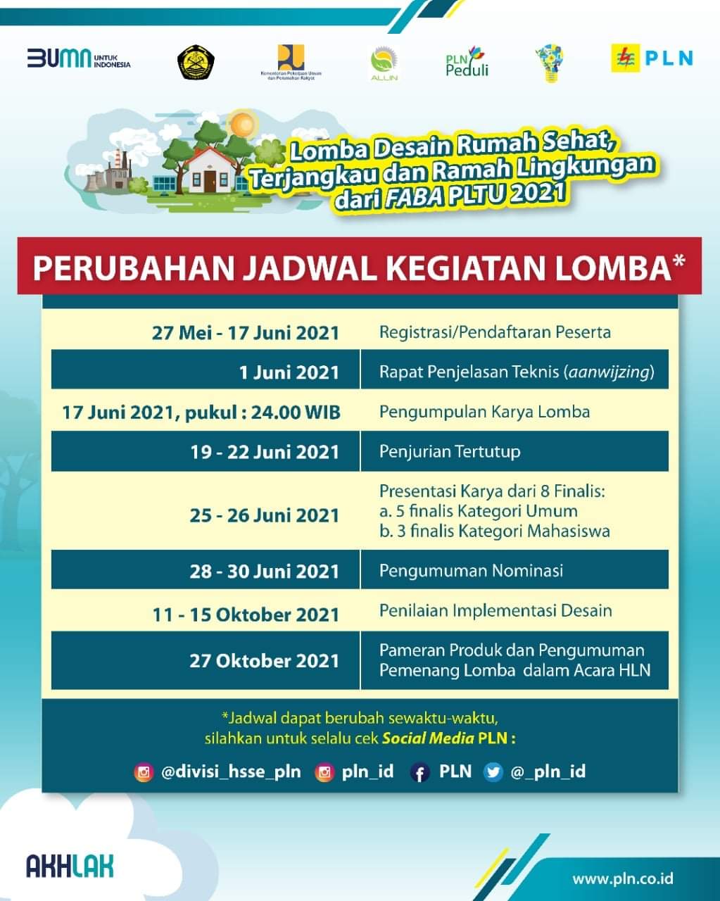 JAKARTA- Batas waktu pendaftaran Lomba Desain Rumah Sehat, Terjangkau dan Ramah Lingkungan dari Material Fly Ash dan Bottom Ash (FABA) PLTU Batubara yang digelar PLN diperpanjang hingga 17 Juni 2021.