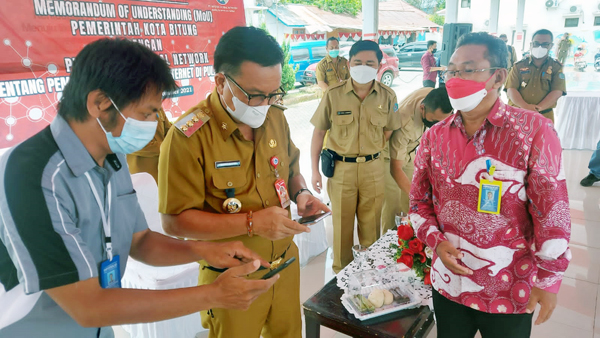 Usai penandatangan MoU, Walikota Bitung Maurits Mantiri dan pimpinan PT IGN mencoba akses internet gratis untuk masyarakat.(ist)