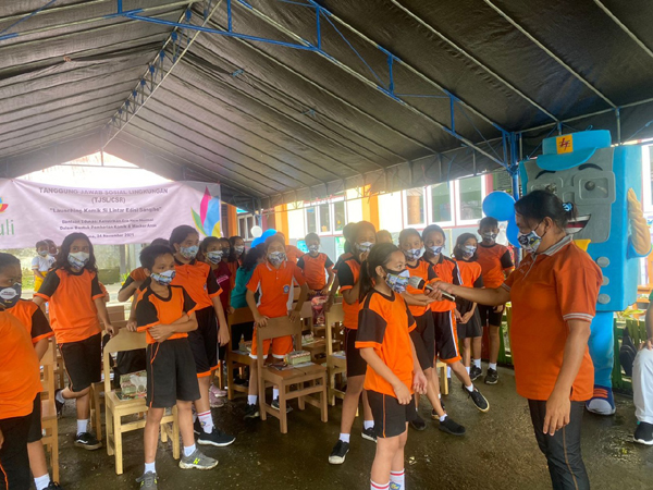 METRO, Tahuna- PLN Peduli lewat program Tanggung Jawab Sosial Lingkungan (TJSL), memberikan bantuan berupa komik dan masker Si Lintar bagi anak-anak di Kabupaten Kepulauan Sangihe, padaRabu (24/11), di SD GMIST Bethlehem Sangihe.