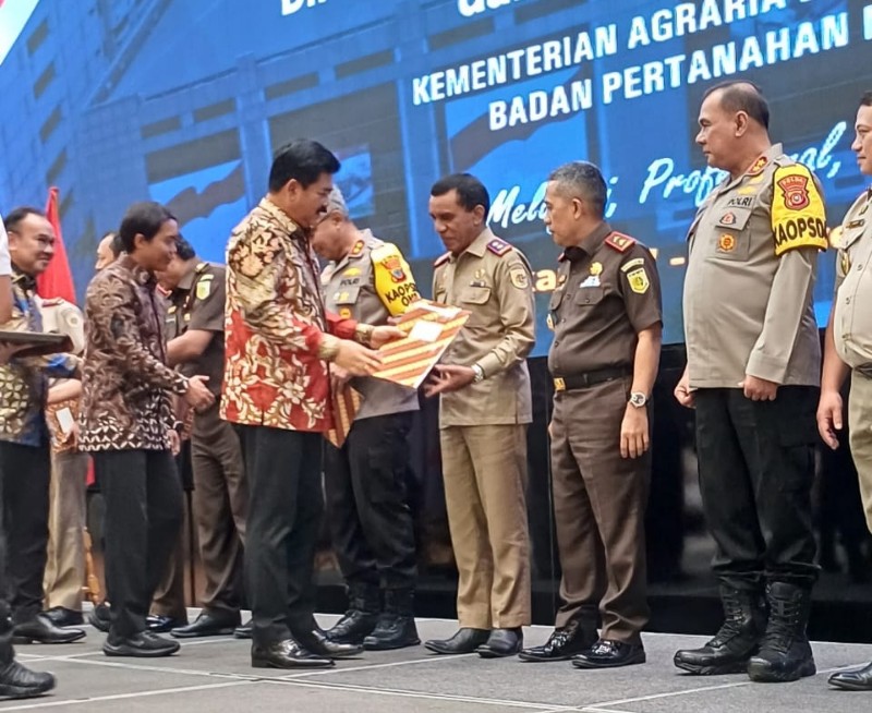 Penghargaan diterima langsung oleh Kepala Kantor Wilayah BPN Sulut, Jaconias Walalayo, didampingi Kajati Sulut, Dr Andi Muhammad Taufik, dan Kapolda Sulut, Irjen Pol Drs Setyo Budiyanto, SH, MH.