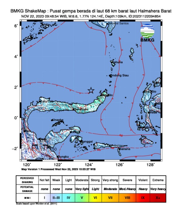 Gempabumi dirasakan di Minahasa, Minahasa Utara, Tidore, Bitung, Halmahera Barat, Halmahera Utara, Ternate, Manado, Siau, Minahasa Tenggara, Tomohon, Talaud, Halmahera Timur, Kotamobagu, Morotai, Kepulauan Sula.