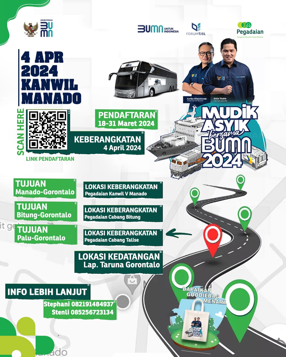 METRO, Manado- Dalam rangka menyambut Hari Raya Idul Fitri 1445 H, PT Pegadaian kembali menyelenggarakan program mudik gratis sebagai bagian dari komitmen perusahaan untuk dapat memberikan manfaat kepada masyarakat Indonesia.
