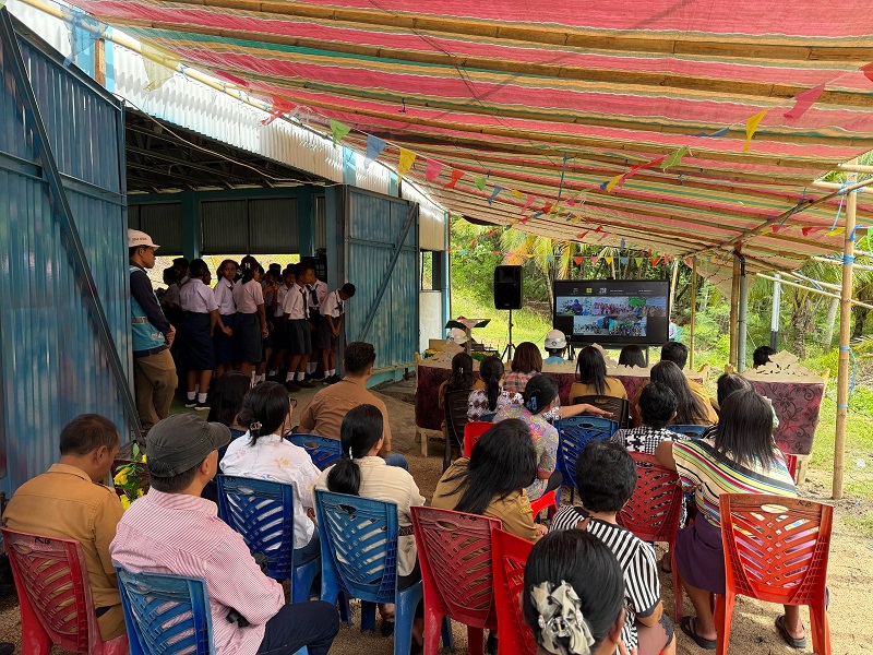 Situasi di Pulau Buhias, Sitaro yang sedang mengikuti peresmian listrik 24 jam nyala yang dilakukan secara daring, tampak pemerintah daerah, masyarakat, serta anak-anak SMP yang mengikuti jalannya acara.