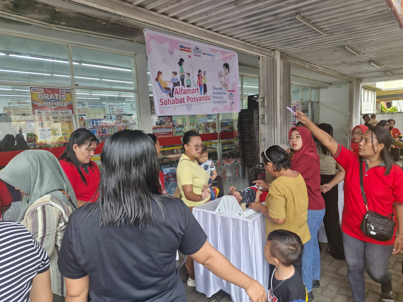 Salah satu kegiatan berlangsung di Alfamart Singkil di Manado, Selasa ([13/1/2025). Para ibu terlihat antusias membawa anak-anak mereka untuk mengikuti pemeriksaan oleh kader Posyandu bersama dinas kesehatan setempat.