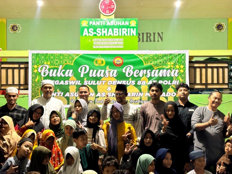 KORANMETRO.COM- Personel Satgaswil Sulut Densus 88 AT Polri, berbagi dengan anak yatim di Kota Manado, di Panti Asuhan As Shabirin, Kota Manado, pada Senin (9/3/2026).