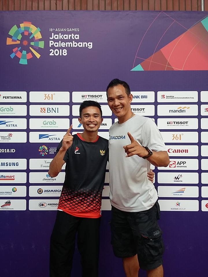 Roy Maengkom bersama Abdul Malik, peraih medali emas cabor pencak silat Asian Games
